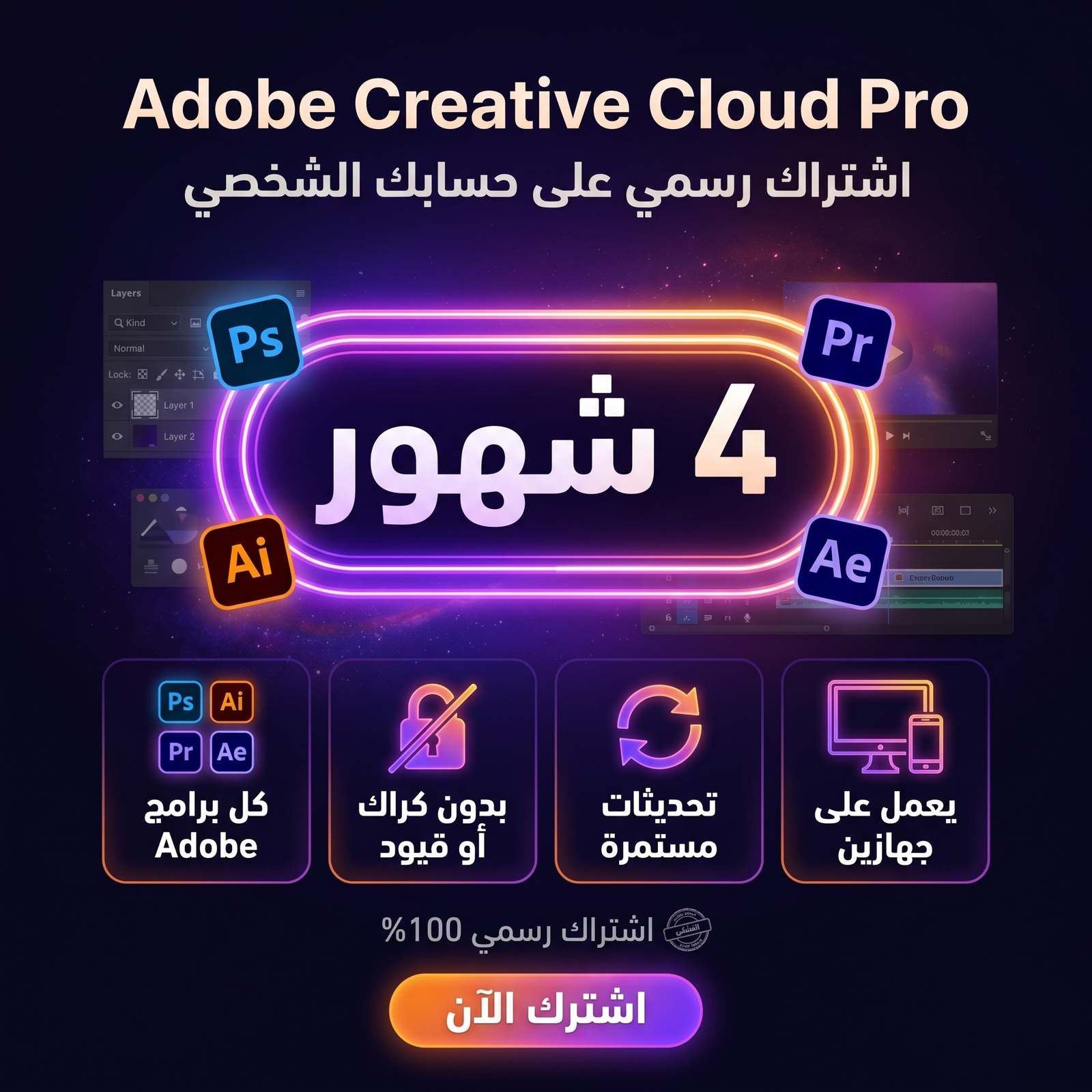 احصل على اشتراك Adobe Creative Cloud لمدة 4 شهور الرسمي على حسابك الشخصي يتم توفيره من خلالنا، وجاهز للاستخدام فورًا.